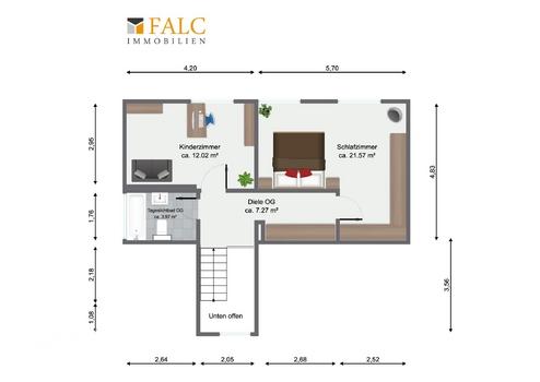 Das Obergeschoss bildet den privaten Rückzugsbereich des Hauses. Hier befinden sich ein komfortabeles Schlafzimmer, ein Kinderzimmer sowie eine Diele mit praktischen Einbauschränken, die wertvollen Stauraum bieten. Komplettiert wird diese Ebene durch ein helles Tageslichtbad mit Duschwanne. Bei Bedarf lässt sich das großzügige Schlafzimmer auch baulich abtrennen, sodass im Obergeschoss ein weiteres Zimmer entstehen kann und insgesamt drei Räume zur Verfügung stehen.