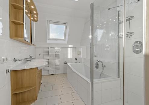 Zwei Abstellkammern und ein zusätzliches Gäste-WC lassen Utensilien schnell verschwinden und Stau im Bad vermeiden.