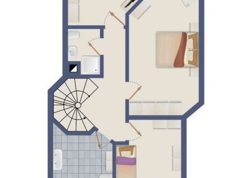 Im Dachgeschoss befindet sich ein großer und ein kleinerer Studioraum sowie ein Abstellraum, in dem auch die Gaszentralheizung aus 12/2015 untergebracht ist. Die Decken sind in der obersten Etage bis in den Giebel geöffnet, was den Räumen eine besondere Atmosphäre verleiht.