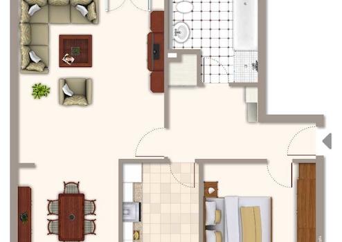 In der Küche findet sich zusätzlich Platz für einen Frühstückstisch. Das Abendessen können Sie auf dem westlich ausgerichteten Balkon bis zum Sonnenuntergang genießen. In der Diele befindet sich ein Garderobenbereich und eine Abstellkammer.