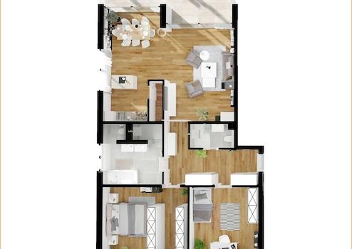 Über die Diele gelangen Sie zum Schlafzimmer, Kinder-/Arbeitszimmer, Gästebad sowie Masterbad. Die Bäder sind mit hochwertigen Design-Objekten - ganz im Trend der Zeit – ausgestattet.
