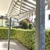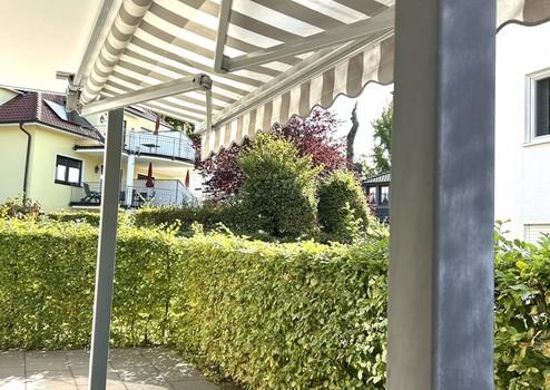Eine uneinsehbare Terrasse mit elektrischer Markise bietet Platz für Gartenmöbel und Pflanzkübel.