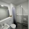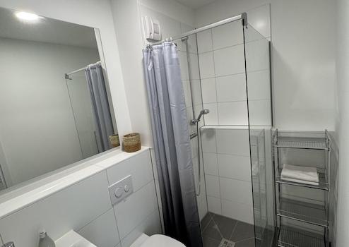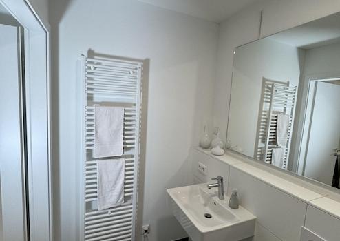 - Modern ausgestattetes Badezimmer mit bodentiefer Glasdusche, Handtuchheizkörper und Spiegel