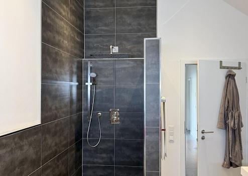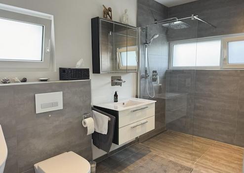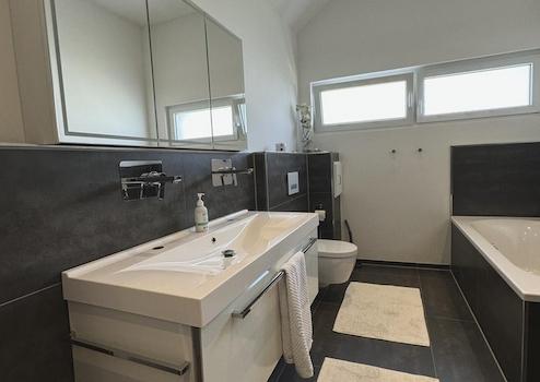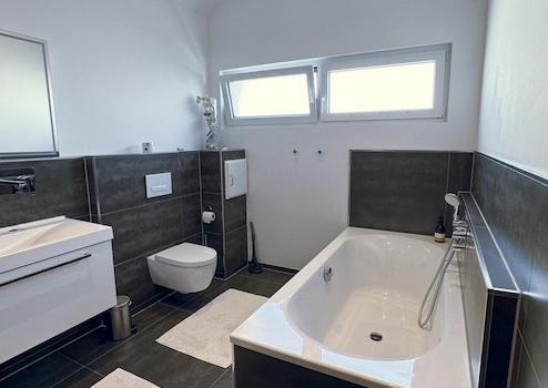• Großes Familienbad – ein Wohlfühlbad mit bodengleicher Dusche, Badewanne, Doppelwaschbecken, WC und Wäscheabwurf – perfekt für Familienalltag und Entspannung