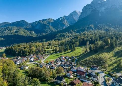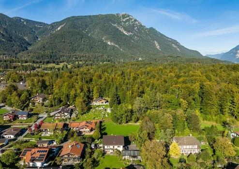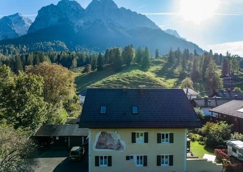 Die Alpenvilla befindet sich in einer ruhigen Nebenstraße von Grainau mit malerischem Blick auf die majestätische Zugspitze und das umliegende Alpenpanorama.