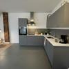 Moderne Wohnküche mit direktem Zugang zum Balkon und Blick ins Grüne