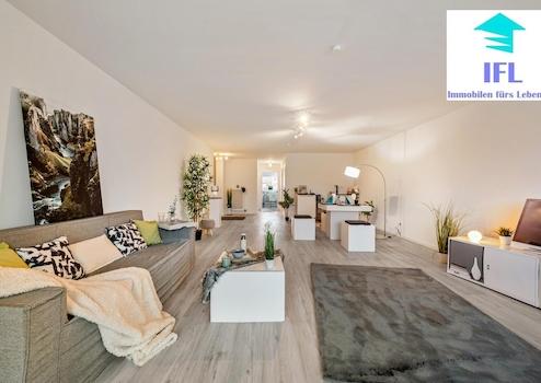 Wohnzimmer: Das großzügige Wohnzimmer erstrahlt in neuem Glanz mit hochwertigem Vinylboden, einer modernen Wandgestaltung und ausreichend Platz für eine gemütliche Sitzecke sowie ein Home-Office. Große Fenster sorgen für eine angenehme, helle Atmosphäre.