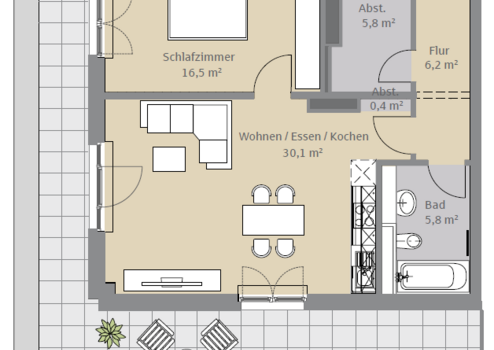 Die Wohnung verfügt über einen großzügigen Wohnbereich mit offener Einbauküche, einem Badezimmer mit Badewanne mit Duscharmatur und einem Schlafzimmer. Ein Abstellraum befinde sich in der Wohnung.