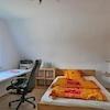 ### Please note the availability date! Bitte das Verfügbarkeitsdatum beachten! ### möbliertes Apartment in DD-Mickten; Wohnraum mit Bett, Kleiderschrank, Sessel, TV und Schreibtisch; Küchennische mit Esstisch; Bad mit ...