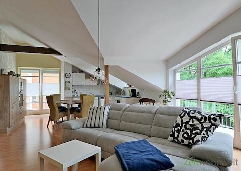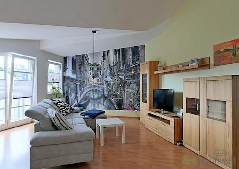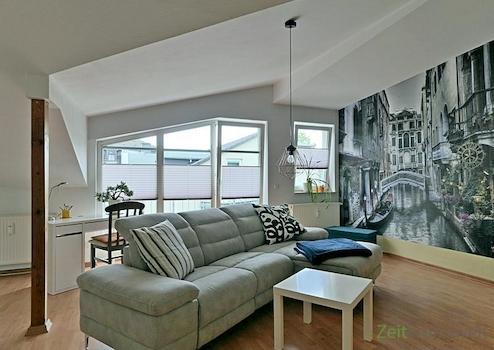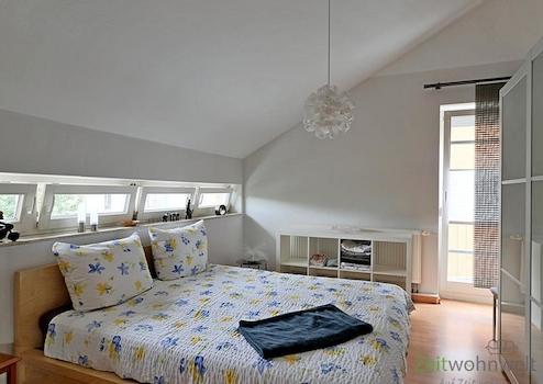### Please note the availability date! Bitte das Verfügbarkeitsdatum beachten! ### möbliertes Dachgeschoss-Apartment mit breiter Fensterfront; WLAN inklusive; großer Wohnraum mit breitem Bett, Kleiderschrank, Wand-TV, ...