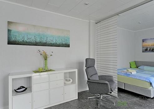### Please note the availability date! Bitte das Verfügbarkeitsdatum beachten! ### möbliertes Dachgeschoss-Apartment mit breiter Fensterfront; WLAN inklusive; großer Wohnraum mit breitem Bett, Kleiderschrank, Wand-TV, ...