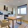 The bedroom is furnished with a bed (1.60m x 2.00m) and a spacious wardrobe. The kitchen features a large dining table that can also be used as a desk.