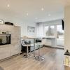 Waschtrockner, Geschirrspüler, Backofen mit Reinigungsfunktion sowie Geräten wie Kaffeemaschine, Toaster, Wasserkocher lässt kaum Wünsche offen. Ein Bar-Tisch mit 2 hochwertigen lederbezogenen