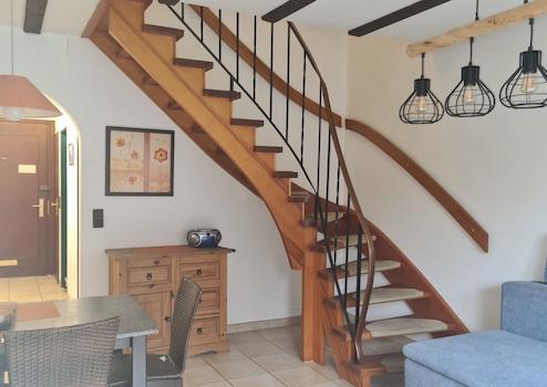 - Wohn-Esszimmer mit Treppenaufgang und Terrassenzgang