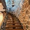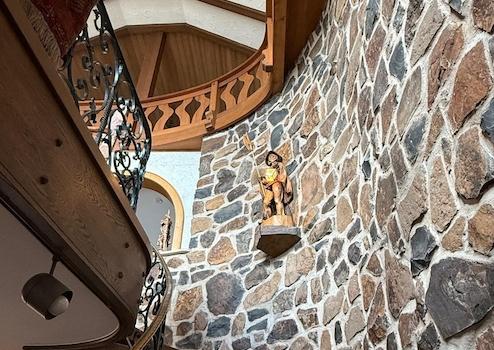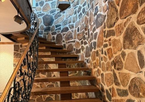Das Treppenhaus komplett mit Sandsteinmauer und schmiedeeisernem Geländer ist ein echter „Hingucker“ – nicht nur für Naturstein-Liebhaber eine wahre Augenweide.