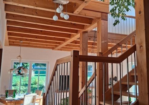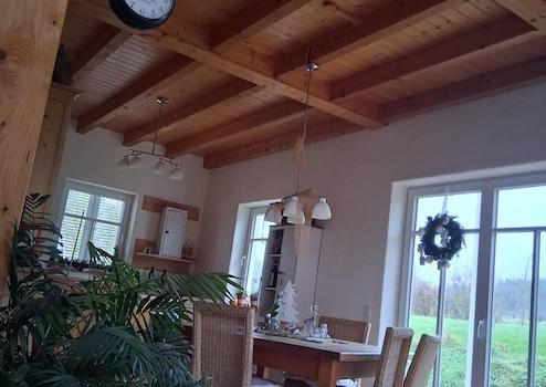 Durch die Aufdachisolierung fällt der Blick auf die Dachkonstruktion die komplett sichtbar ist.
