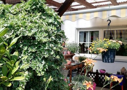 Große geflieste Terasse , Überdacht mit Markise