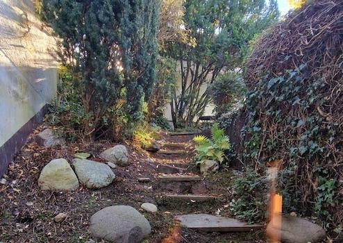 Die Häuser in dieser Zeile und die darüber liegenden wurden geschickt versetzt zueinander in leichter Hanglage gebaut und bieten somit viel Privatsphäre und Ruhe mit einem uneinsichtigen Südgarten.