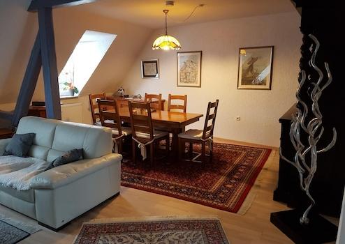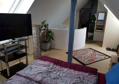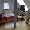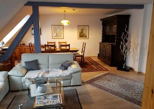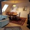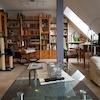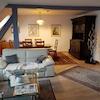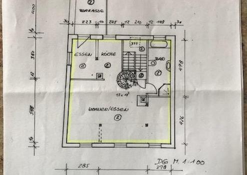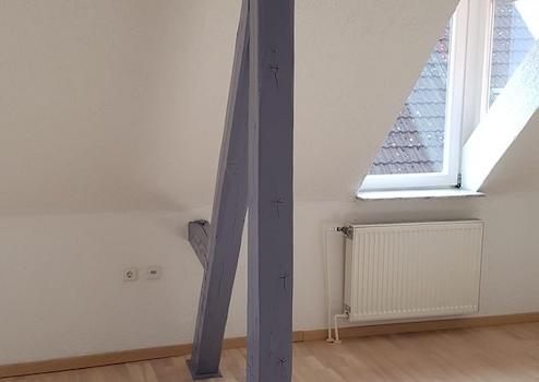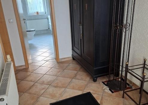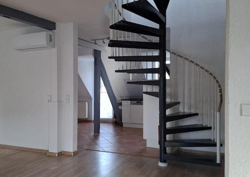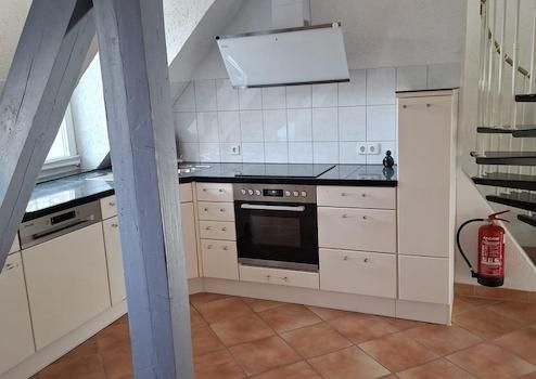 Die Hauptwohnung im Obergeschoss mit insges. ca. 100 qm wurde im Rahmen der Kernsanierung 2001 "loftartig" ausgebaut, Zwischenwände wurden entfernt, das Gebälk freigelegt, so dass ein moderner, offener Wohn-Essbereich mit Küchenteil entstand. Im Wohn- Essbereich ist Parkett verlegt, der Küchenboden, sowie der Fußboden im Badezimmer sind gefliest. Die Küche ist mit einer Alno-Einbauküche und separatem großen Einbauschrank ausgestattet. Geschirrspüler und E-Herd mit Induktionskochfeld und Umluft-Backofen (Pyrolyse) sind in 2025 neu installiert worden.