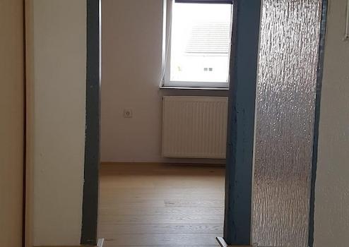 Die Wohnung im Erdgeschoss (Einliegerwohnung oder Büroräume) mit einer Größe von ca. 57 qm verfügt über 3 Zimmer, eine Küche mit Küchenzeile, sowie einem außenliegenden Bad mit Dusche und Waschmaschinenstellplatz. Die Wohnräume im EG sind gefliest, im OG mit Parkett belegt, die Wände sind mit Rauputz versehen.