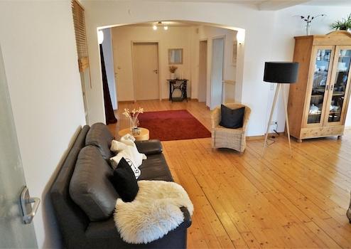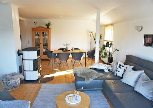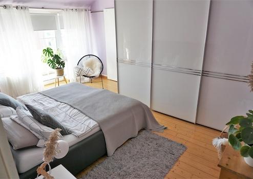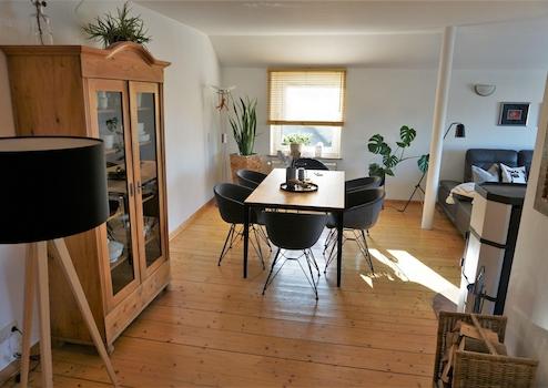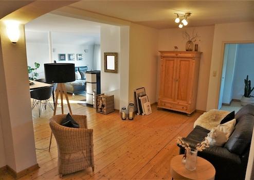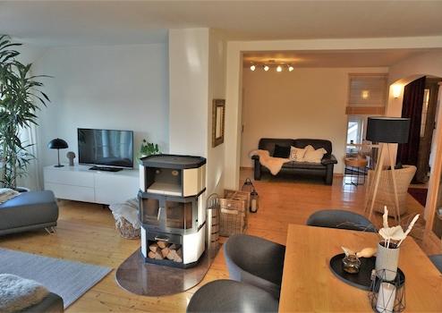 Echtholzdielen, neuer Kaminofen, begehbarer Kleiderschrank, Einbauküche mit Kücheninsel und angrenzendem Hauswirtschaftsraum, ein großer Süd-Balkon und ein kleiner Balkon, großes Vollbadezimmer und ein Gäste-WC, Kellerraum, optionale Garage (passend für 2 PKWs hintereinander)