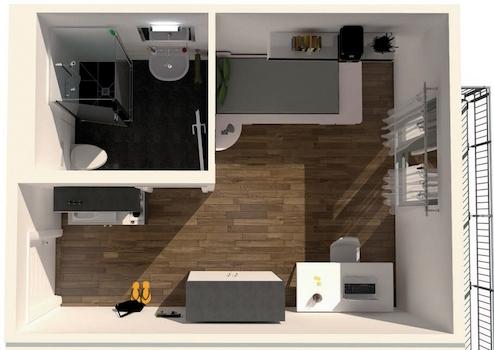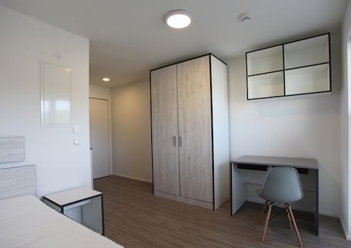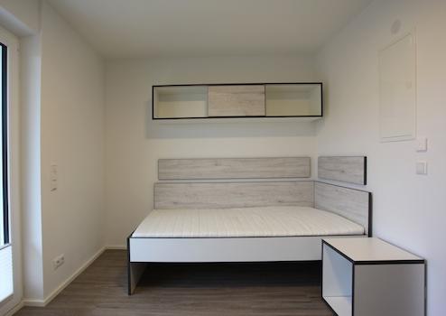 - Standartmöblierung: ein Bett, Kleiderschrank, Schreibtisch mit Stuhl und einer kleinen Küchenzeile mit Ceranfeld, Kühlschrank, Spühlbecken und Hängeschrank.
