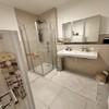 ein stilvolles Badezimmer mit Doppelwaschbecken und bodengleicher Regenwalddusche,