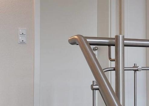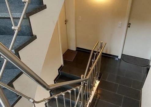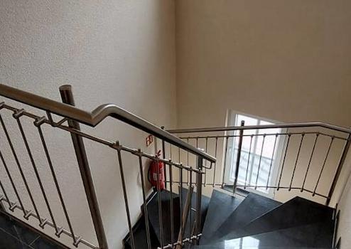 Sie betreten die Villa Vivaldi durch ein exklusiv gestaltetes Treppenhaus, mit schwarzem Granit und Edelstahlgeländer.