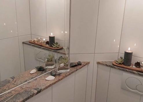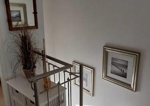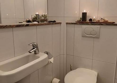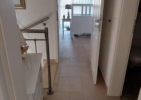 Die Maisonette Wohnung befindet sich in der zweiten Etage. Man betritt zuerst den hellen Flur. Zur linken Seite befindet sich das Gäste-WC, welches hochwertig mit Villeroy und Boch Keramik, Granitboden und Fußbodenheizung ausgestattet ist. Zur rechten Seite ist ein großzügiger Abstellraum, der genug Platz für die Garderobe, Schuhe etc. bietet.