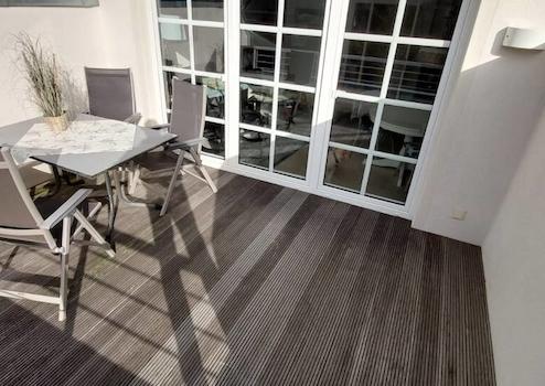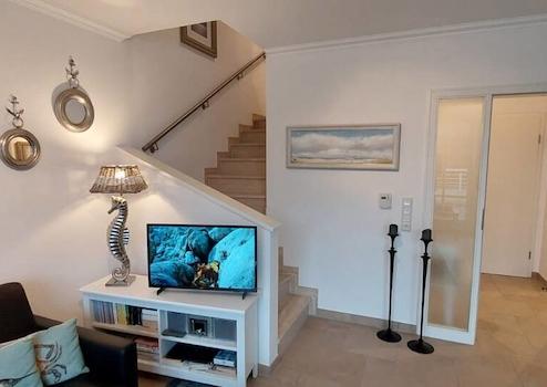 Durch eine große Glasstiltür kommt man in den lichtdurchfluteten Wohnbereich. Dieser beinhaltet die hochwertige weiße Einbauküche, den Essbereich und den Wohnbereich. Dieser Bereich ist komplett, so wie die obere Etage, mit hellen sandfarbenen Fliesen ausgestattet, die an den Sandstrand erinnern. Vor dem Wohnbereich befindet sich die große Dachterrasse, die mit Bangkirai Holz belegt ist. Die Dachterrasse hat eine Größe von ca. 14 qm. Die Terrasse ist wind- und sichtgeschützt und bietet genügend Privatsphäre.