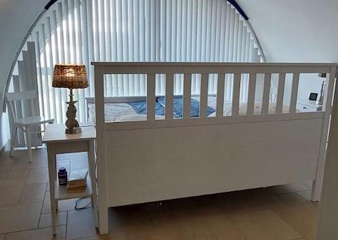 Das zweite Schlafzimmer, ebenfalls mit Rundbogenfenster, bietet einen Ausblick bis auf das Festland und hat zwei Einzelbetten und diverse Schränke.