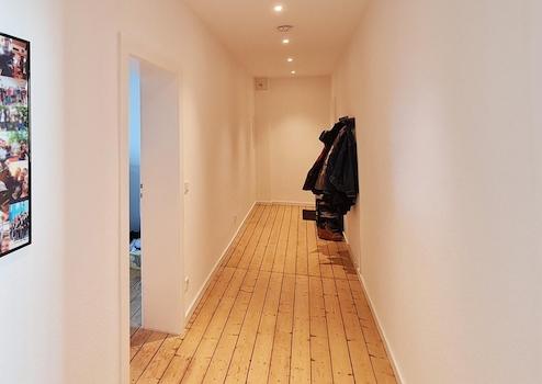 Auch die Elektrik wurde vollständig erneuert. Die Decken wurden abgehängt und im Flur, in der Küche sowie im Bad mit modernen Deckenspots ausgestattet. Wände und Decken erhielten einen neuen Putz. Zudem wurden die straßenseitigen Fenster und das Badfenster komplett ausgetauscht und die Loggia geschlossen.