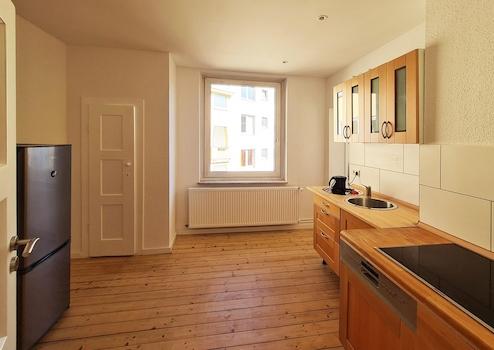 Ein besonderes Highlight sind die originalen, aufwendig aufgearbeiteten Dielenböden, die der Wohnung eine warme und authentische Atmosphäre verleihen.
