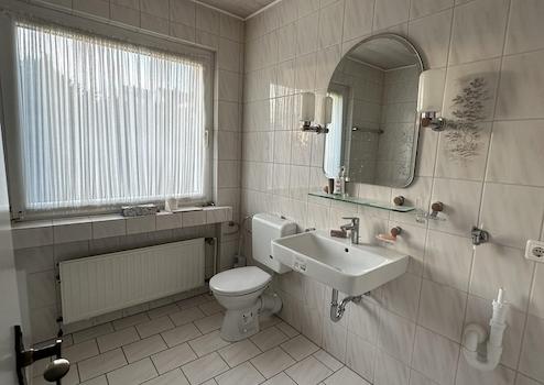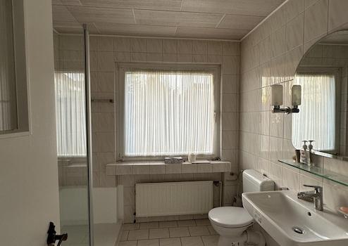 Das Tageslichtbad verfügt über ein großes Fenster und ist mit einem neuen Waschbecken sowie einem neuen WC ausgestattet. Bereits vor wenigen Jahren wurde die ehemalige Badewanne durch eine großzügige, moderne Dusche ersetzt.