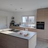 Die Küche mit separater Speisekammer ist absolut hochwertig ausgestattet. Die Elektrogeräte sind voll integriert, die grifflosen Schubladen allesamt gedämpft. Bei der modernen Kochinsel ist der Dunstabzug im Induktionskochfeld integriert. Beide Küchenarbeitsplatten sind massiv aus Stein. Die Armatur stellt aus einem Hahn sowohl gekühltes, gesprudeltes als auch kochendes Wasser bereit.