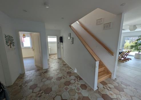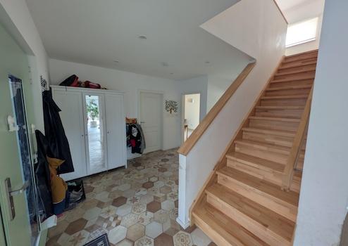 Nach dem Betreten durch die Eingangstür befindet man sich im Flur des Erdgeschosses. Von dort erreicht man das große Wohnzimmer mit Wohnküche, ein Badezimmer, einen Wohnraum und den Hauswirtschaftsraum. Damit befinden sich im Erdgeschoss alle Notwendigkeiten um auch barrierefrei wohnen zu können.