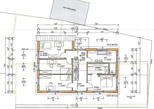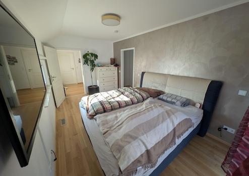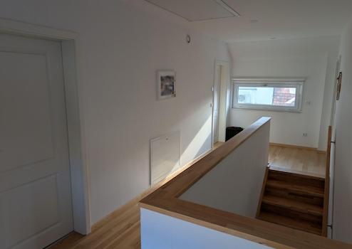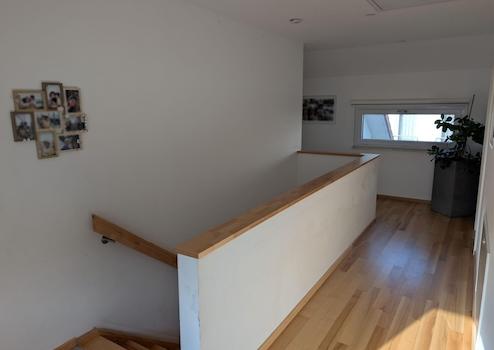 Über die beleuchtete Massivholztreppe mit unterbautem Schuhschrank gelangen sie in die Galerie des Obergeschosses. Von dort erreichen sie das Elternschlafzimmer mit begehbarem Kleiderschrank, das große Badezimmer mit Badewanne und großer ebenerdiger Dusche sowie die 3 weiteren Wohnräume.