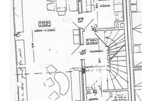 Erdgeschoss: Wohn-/Essbereich, Küche, Windfang und Flur mit Treppenhaus und Zugang zum Keller