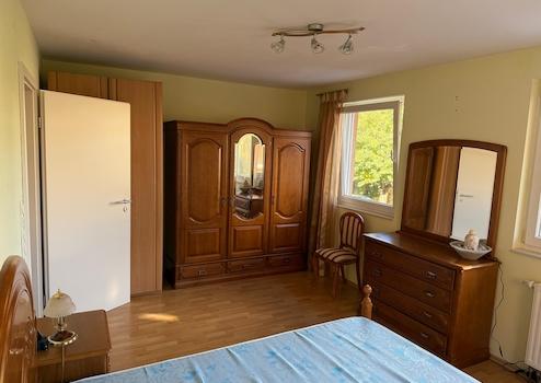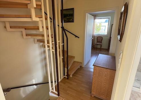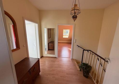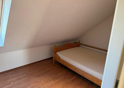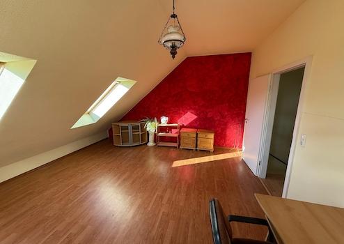 Im ausgebauten Dachboden stehen ein weiteres Wohnzimmer, ein Schlafzimmer sowie ein Badezimmer mit Duschkabine zur Verfügung. Der Raum ist hell und freundlich gestaltet – mit einem Normalfenster und drei Velux-Dachfenstern in den Dachschrägen, die für viel Tageslicht sorgen.