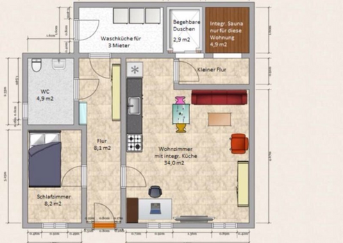 Die Wohnfläche teilt sich auf in einen Flur, ein kleines Schlafzimmer (ca. 3,15 m × 2,65 m / 8,3 m² – ausschließlich für eine Person geeignet), ein Wohnzimmer mit offener Küchenwand, bei der alle Anschlüsse bereits vorbereitet sind, sowie ein modernes Badezimmer mit begehbarer Dusche und WC.