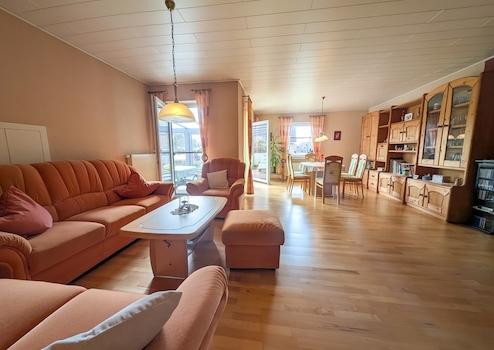 - Wohn/Esszimmer mit Ofen und Durchgang zum Wintergarten