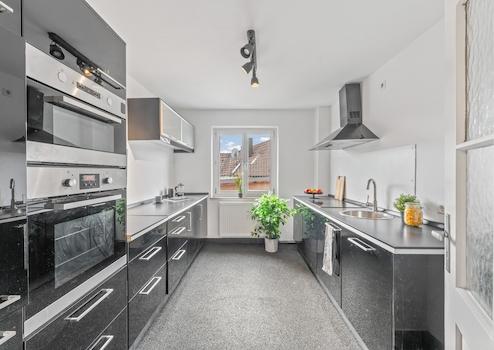 Ebenfalls vorhanden ist eine Einbauküche inklusive Herd, Geschirrspülmaschine und Dunstabzug. Sie bietet viel Stauraum, kurze Wege und schafft den Mittelpunkt des Alltags.