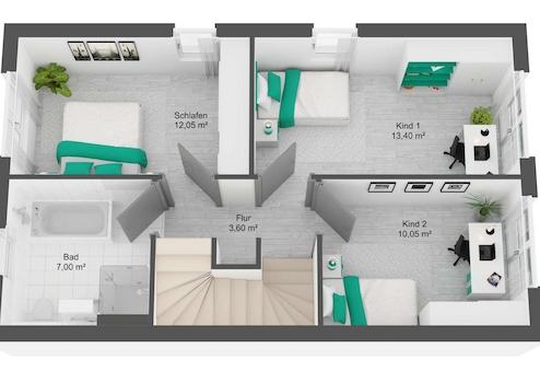 Über eine massive Treppe in Holzoptik gelangen Sie ins erste Obergeschoss. Hier erwarten Sie zwei Kinder- oder Arbeitszimmer, ein geräumiges Schlafzimmer und ein Tageslichtbad mit hochwertigen Sanitärobjekten wie einem wandhängendem WC, einer großzügigen Dusche sowie einem zusätzlichen Infrarot-Heizkörper.