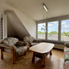Auch diese Wohnung bietet einen hellen Wohnbereich mit Stäbchenparkett und Zugang zu einem separaten Balkon mit Wasserblick. Die Küche ist offen integriert und gut belichtet; derzeit wird sie als Hauswirtschaftsraum genutzt.