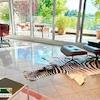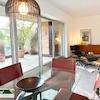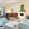 Das großzügige Wohnzimmer im open-Space-Charakter mit gemütlicher Couch, Couchtisch, Eames Lounge Chair, Sideboard, Kamin, Homeoffice-Arbeitsplatz und Esstisch mit Stühlen bietet Platz zum Wohlfühlen. Über eine große Terrassentür gelangt man auf den überdachten großen Balkon mit schöner Bepflanzung.