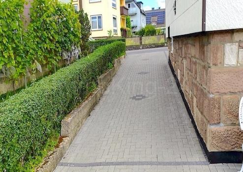 Vor dem Haus befindet sich noch ein pflegeleichter Vorgarten ... rechts neben dem Haus befindet sich ein gepflasterter Weg zum Gartenbereich.