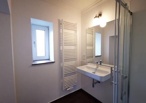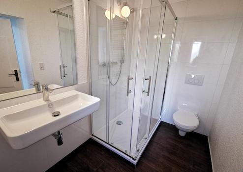 Das Duschbad mit Fenster begeistert mit einer 120cm großen Dusche mit Glas -Trennwand.