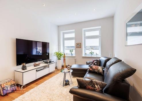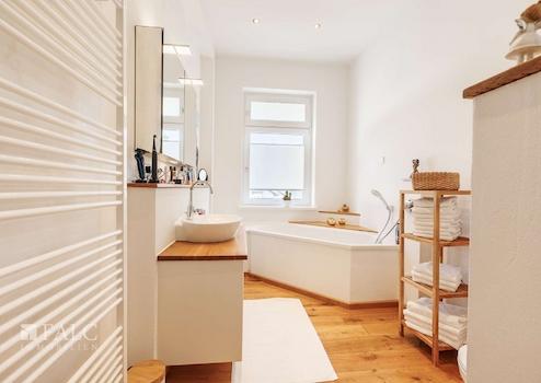 Im ersten Obergeschoss befindet sich eine weitere 2-Zimmer-Wohnung mit ca. 67 m². Sie verfügt über einen großen, offenen Wohn-Essbereich mit moderner Miele Küche aus 2024 (Eigentum Hausbesitzer), ein Schlafzimmer mit angrenzendem Tageslichtbad, das sowohl mit einer Dusche als auch mit einer Badewanne ausgestattet ist. Die Schlafzimmerfenster nach hinten verfügen über elektrische Rollladen. Diese sind bereits bei der Kernsanierung des gesamten Hauses 2006/2007 eingebaut worden. Auch dieser Wohnung ist ein separater Abstellraum im Hausflur zugeordnet.