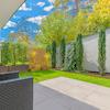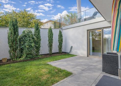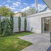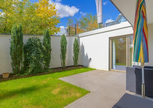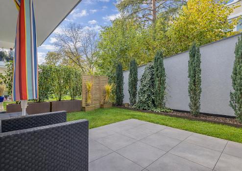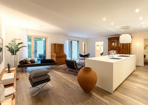 Das Herzstück der Wohnung bildet der ca. 50 m² große Wohn- und Essbereich. Großflächige Bodentiefe Fensterfronten sorgen hier für eine helle, offene Atmosphäre und eröffnen den direkten Zugang zur Terrasse und in den Garten. Das Schlafzimmer verfügt über ein angrenzendes, begehbares Ankleidezimmer mit maßgefertigten Einbauten, Regalsystemen und einem wandhohen Spiegel.
