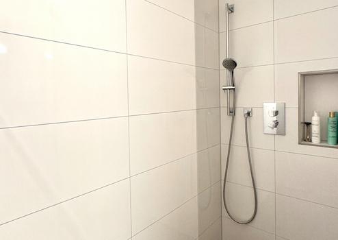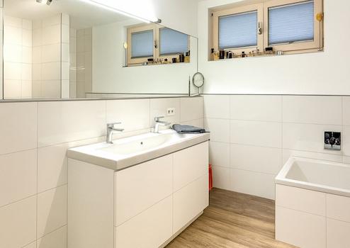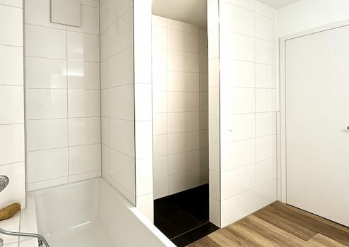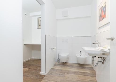 Das sehr hochwertige ausgestattete Badezimmer lässt keine Wünsche offen: eine großzügige Walk-in-Dusche, eine Badewanne sowie maßgefertigte Badmöbel schaffen ein elegantes Ambiente. Ergänzt wird es durch ein separates WC mit Bidet, das unmittelbar an den Abstellraum anschließt.